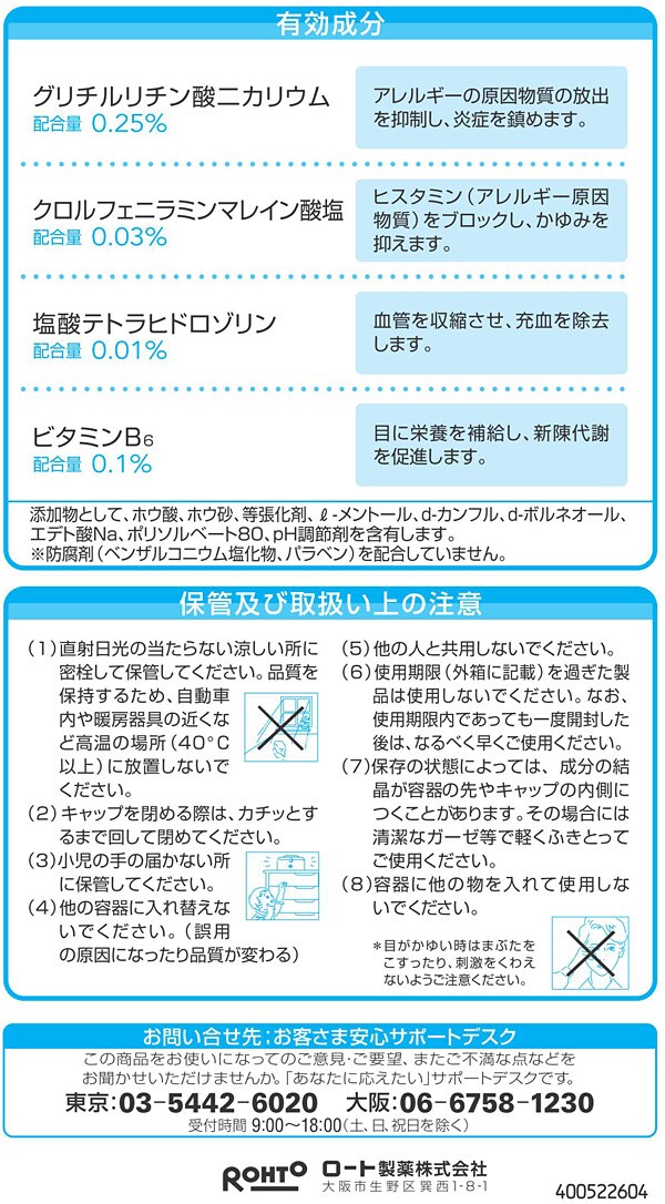 | グリチルリチン酸二カリウム:0.25% クロルフェニラミンマレイン酸塩:0.03% 塩酸テトラヒドロゾリン:0.01% ビタミンB6:0.1% 添加物として、ホウ酸、ホウ砂、等張化剤、L-メントール、d-カンフル、d-ボルネオール、エデト酸Na、ポリソルベート80、pH調整剤を含有します。 ※防腐剤(ベンザルコニウム塩化物、パラベン)を配合していません。 |
