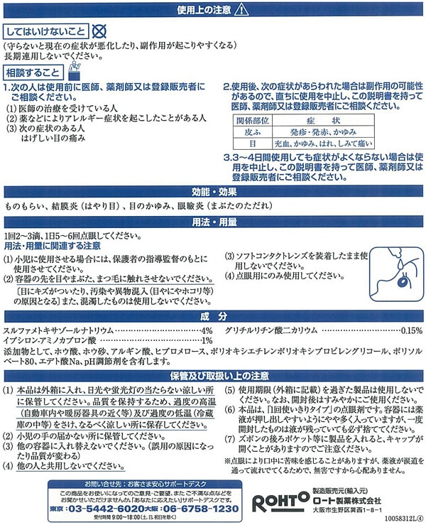 | スルファメトキサゾールナトリウム:4% イプシロン-アミノカプロン酸:1% グリチルリチン酸二カリウム:0.15% 添加物として、ホウ酸、ホウ砂、アルギン酸、ヒプロメロース、ポリオキシエチレンポリオキシプロピレングリコール、ポリソルベート80、エデト酸Na、pH調整剤を含有します。 |