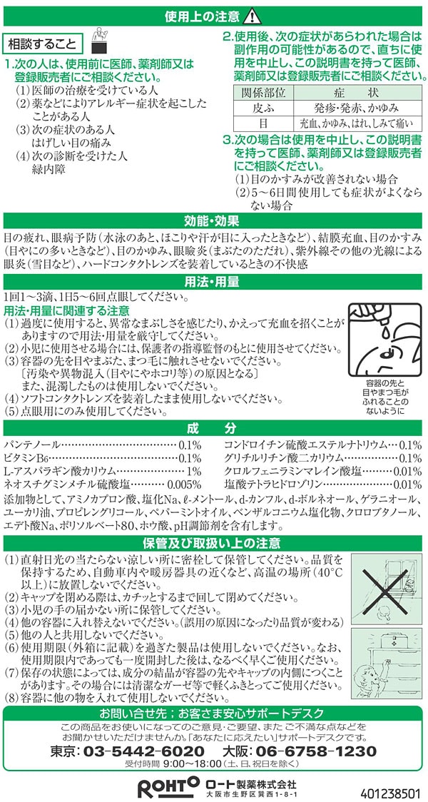 | ・目の疲れ、眼病予防(水泳のあと、ほこりや汗が目に入ったときなど)、結膜充血、目のかすみ(目やにの多いときなど)、目のかゆみ、目瞼炎(まぶたのただれ)、紫外線その他の光線による眼炎(雪目など)、ハードコンタクトレンズを装着しているときの不快感 ★用法・用量に関連する注意 ・過度に使用すると、異常なまぶしさを感じたり、かえって充血を招くことがありますので用法・用量を厳守してください。 ・小児に使用させる場合には、保護者の指導監督のもとに使用させてください。 ・容器の先を目やまぶた、まつ毛に触れさせないでください(汚染や異物混入(目やにやホコリ等)の原因となる)。また、混濁したものは使用しないでください。 ・ソフトコンタクトレンズを装着したまま使用しないでください。 ・点眼用にのみ使用してください。 |