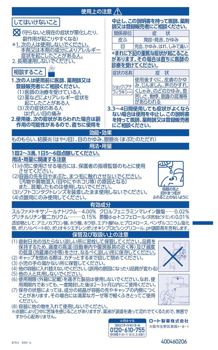 ●細菌に対して強い抗菌力を持つサルファ剤を配合しています。そして、このサルファ剤を目の表面に長くとどめるヒプロメロースを配合し、より高い抗菌効果を目指しました。さらに、ビタミンE配合で、抵抗力の低下した目の血行を促し、ものもらい・結膜炎の治療をサポートします。
