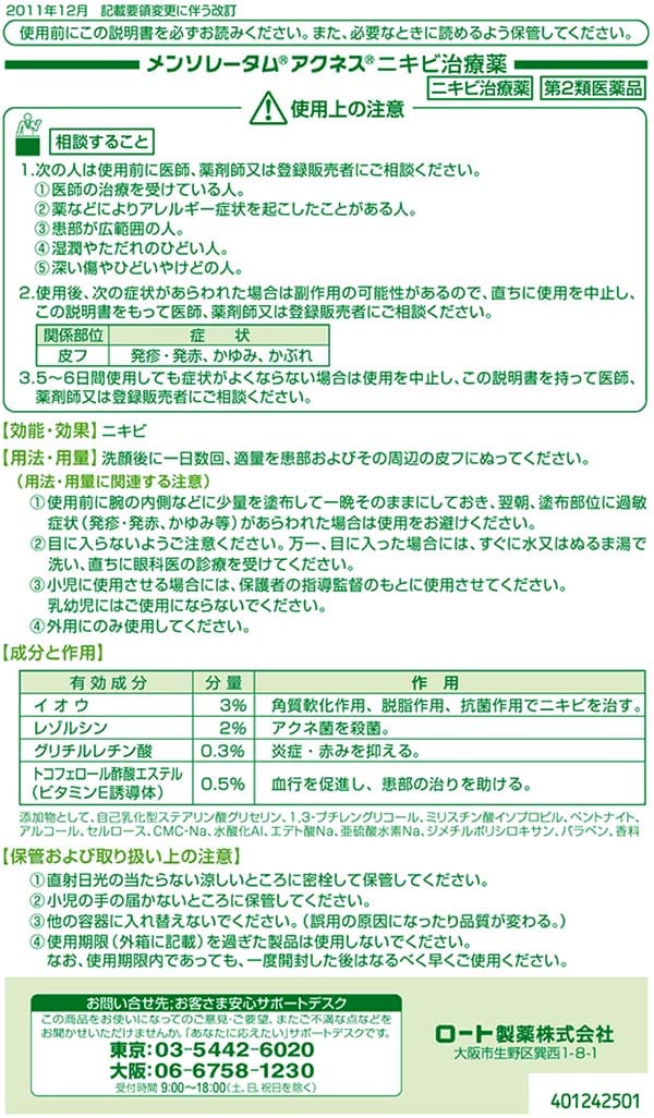 | 有効成分イオウ:3% レゾルシン:2% グリチルレチン酸:0.3% 酢酸トコフェロール(ビタミンE誘導体):0.5% |