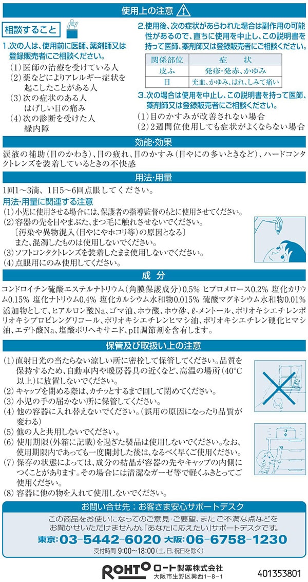 | コンドロイチン硫酸エステルナトリウム(角膜保護成分):0.5% ヒプロメロース:0.2% 塩化カリウム:0.15% 塩化ナトリウム:0.4% 塩化カルシウム水和物:0.015% 硫酸マグネシウム水和物:0.01% 添加物として、ヒアルロン酸Na、ゴマ油、ホウ酸、ホウ砂、L-メントール、ポリオキシエチレンポリオキシプロピレングリコール、ポリオキシエチレンヒマシ油、ポリオキシエチレン硬化ヒマシ油、エデト酸Na、塩酸ポリヘキサニド、pH調節剤を含有します。 |