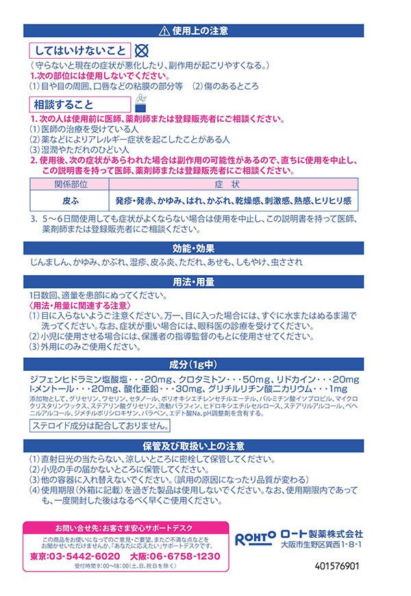 | (1g中) ジフェンヒドラミン塩酸塩:20mg クロタミトン:50mg リドカイン:20mg L-メントール:20mg 塩化亜鉛:30mg グリチルリチン酸二カリウム:1mg 添加物として、グリセリン、ワセリン、セタノール、ポリオキシエチレンセチルエーテル、パルミチン酸イソプロピル、マイクロクリスタリンワックス、ステアリン酸グリセリン、流動パラフィン、ヒドロキシエチルセルロース、ステアリルアルコール、ベヘニルアルコール、ジメチルポリシロキサン、パラベン、エテド酸Na、pH調整剤を含有する。 ※ステロイド成分は配合しておりません。 |