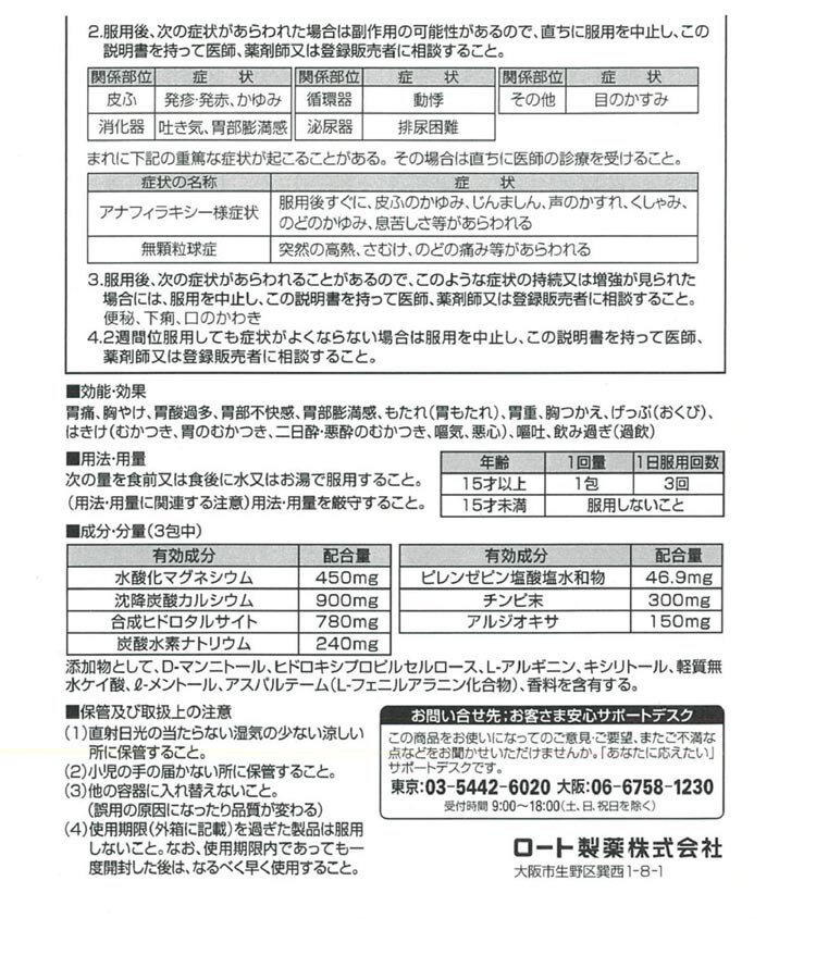 | (3包中) (有効成分:配合量) 水酸化マグネシウム:450mg 沈降炭酸カルシウム:900mg 合成ヒドロタルサイト:780mg 炭酸水素ナトリウム:240mg ピレンゼピン塩酸塩水和物:46.9mg チンピ末:300mg アルジオキサ:150mg 添加物として、D-マンニトール、ヒドロキシプロピルセルロース、L-アルギニン、キシリトール、軽質無水ケイ酸、L-メントール、アスパルテーム(L-フェニルアラニン化合物)、香料を含有する。 |
