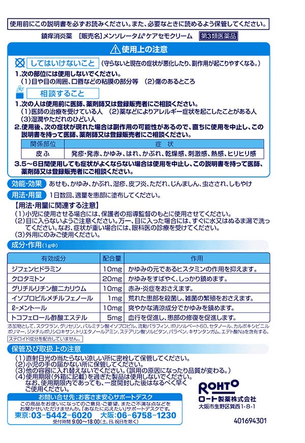 | (1g中) ジフェンヒドラミン:10mg クロタミトン:20mg グリチルリチン酸二カリウム:10mg イソプロピルメチルフェノール:1mg L-メントール:10mg トコフェロール酢酸エステル:5mg 添加物として、スクワラン、グリセリン、パルミチン酸イソプロピル、流動パラフィン、ポリソルベート60、セタノール、カルボキシビニルポリマー、ジメチルポリシロキサン、トリエタノールアミン、ステアリン酸ソルビタン、パラベン、キサンタンガム、エデト酸Naを含有する。 ※ステロイド成分を配合していません。 |