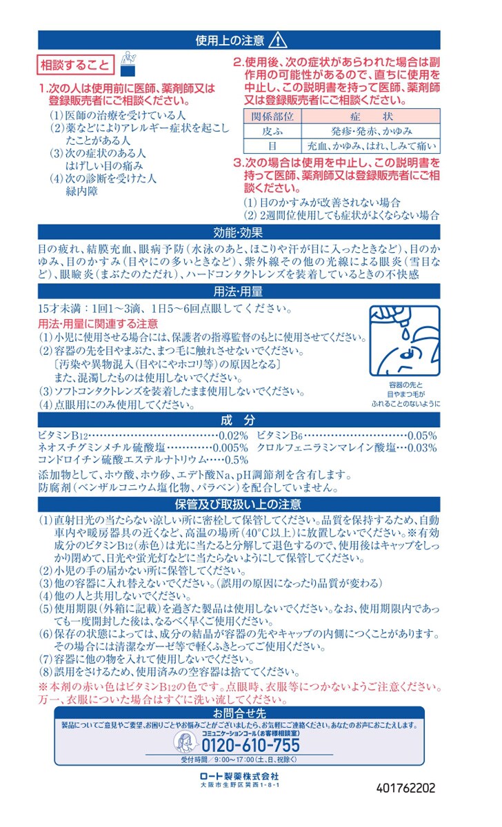 ※本剤の赤い色はビタミンB12の色です。点眼時、衣服などにつかないようご注意ください。万一、衣服に付いた場合はすぐに洗い流してください。