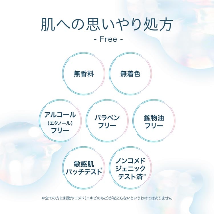 ●弱酸性。無香料・無着色。鉱物油・アルコール(エタノール)・パラベンフリー。