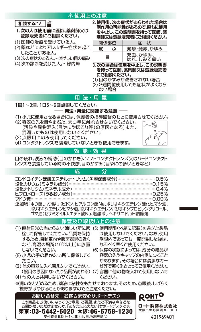 | コンドロイチン硫酸エステルナトリウム(角膜保護成分):0.5% 塩化カリウム(ミネラル成分):0.15% 塩化ナトリウム(ミネラル成分):0.4% ヒプロメロース(うるおい成分):0.25% ブドウ糖:0.09% 添加物:ホウ酸、ホウ砂、ポビドン、ヒアルロン酸Na、ポリオキシエチレン硬化ヒマシ油、ポリオキシエチレンヒマシ油、ポリオキシエチレンポリオキシプロピレングリコール、ゴマ油(セサミオイル)、エデト酸Na、塩酸ポリヘキサニド、pH調節剤 |