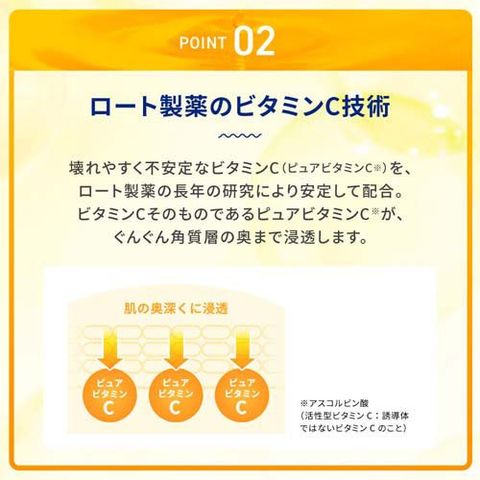 | 有効成分:アスコルビン酸(ピュアビタミンC)、トコフェロール酢酸エステル(ビタミンE誘導体)、グリチルリチン酸ジカリウム、イソプロピルメチルフェノール その他の成分:ビタミンCテトライソパルミテート、エトキシジグリコール、アルピニアカツマダイ種子エキス(アルピニアホワイト)、BG、エデト酸塩、粘度調整剤、香料 |
