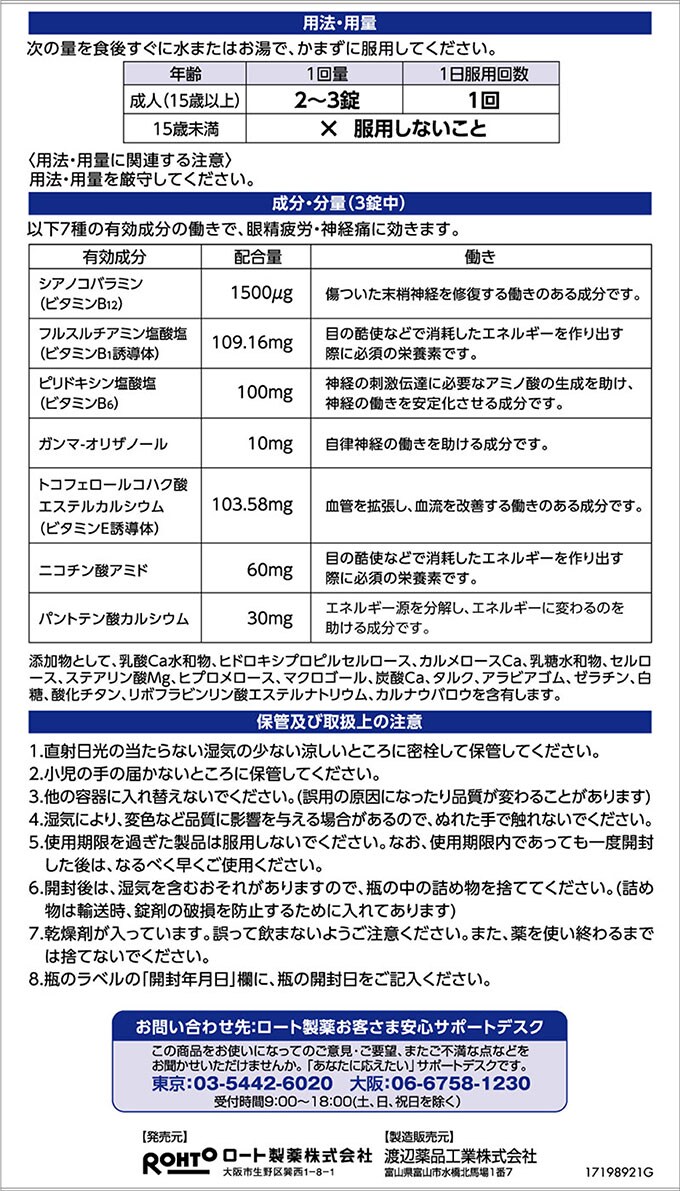 | 3錠中 以下7種の有効成分の働きで、眼精疲労・神経痛に効きます。 有効成分:配合量 シアノコバラミン(ビタミンB12):1500μg フルスルチアミン塩酸塩(ビタミンB1誘導体):109.16mg ピリドキシン塩酸塩(ビタミンB6):100mg ガンマ-オリザノール:10mg トコフェロールコハク酸エステルカルシウム(ビタミンE誘導体):103.58mg ニコチン酸アミド:60mg パントテン酸カルシウム:30mg 添加物として、乳酸Ca水和物、ヒドロキシプロピルセルロース、カルメロースCa、乳糖水和物、セルロース、ステアリン酸Mg、ヒプロメロース、マクロゴール、炭酸Ca、タルク、アラビアゴム、ゼラチン、白糖、酸化チタン、リボフラビンリン酸エステルナトリウム、カルナウバロウを含有します。 |