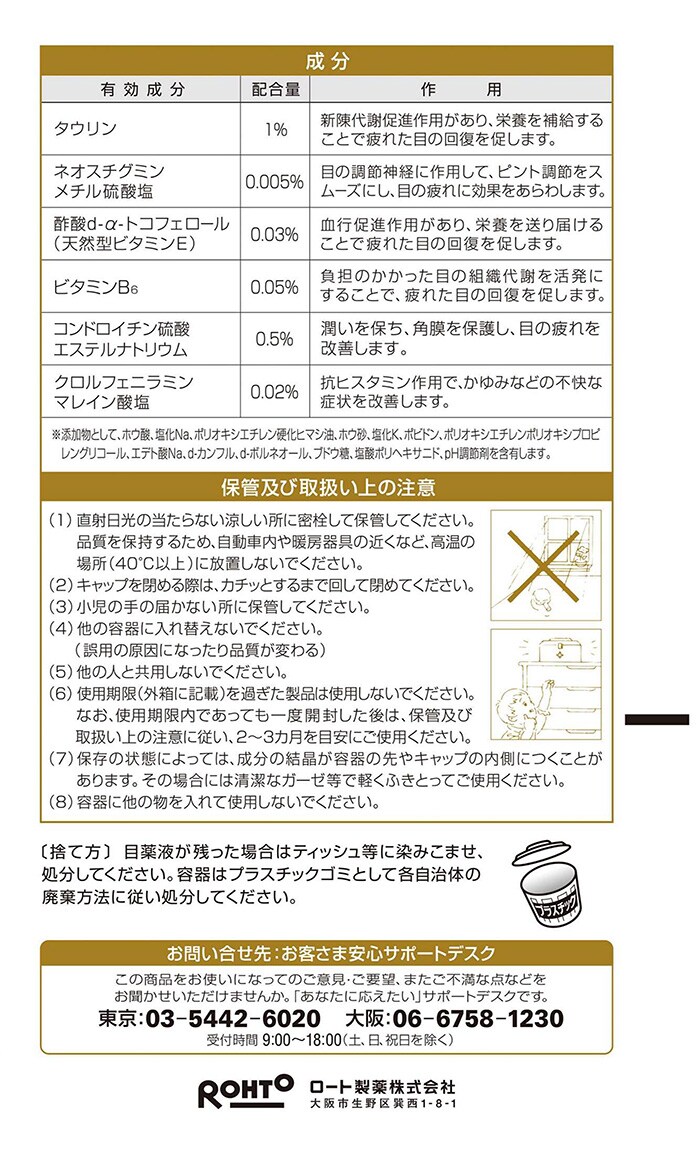 | [有効成分:配合量:作用] タウリン:1%:新陳代謝促進作用があり、栄養を補給することで疲れた目の回復を促します。 ネオスチグミンメチル硫酸塩:0.005%:目の調節神経に作用して、ピント調節をスムーズにし、目の疲れに効果をあらわします。 酢酸d-α-トコフェロール(天然型ビタミンE):0.03%:血行促進作用があり、栄養を送り届けることで疲れた目の回復を促します。 ビタミンB6:0.05%:負担のかかった目の組織代謝を活発にすることで、疲れた目の回復を促します。 コンドロイチン硫酸エステルナトリウム:0.5%:潤いを保ち、角膜を保護し、目の疲れを改善します。 クロルフェニラミンマレイン酸塩:0.02%:抗ヒスタミン作用で、かゆみなどの不快な症状を改善します。 ※添加物として、ホウ酸、塩化Na、ポリオキシエチレン硬化ヒマシ油、ホウ砂、塩化K、ポビドン、ポリオキシエチレンポリオキシプロピレングリコール、エデト酸Na、d-カンフル、d-ボルネオール、ブドウ糖、塩酸ポリヘキサニド、pH調節剤を含有します。 |