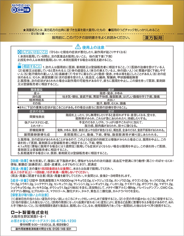 | 12錠中 成分:分量 防風通聖散エキス5000mg(キキョウ2.0g、ビャクジュツ2.0g、カンゾウ2.0g、オウゴン2.0g、セッコウ2.0g、ダイオウ1.5g、トウキ1.2g、シャクヤク1.2g、センキュウ1.2g、サンシシ1.2g、レンギョウ1.2g、ハッカ1.2g、ケイガイ1.2g、ボウフウ1.2g、マオウ1.2g、ショウキョウ0.4g、カッセキ3.0g、ボウショウ1.5gより抽出)を含む。 添加物として、メタケイ酸アルミン酸Mg、バレイショデンプン、CMC-Ca、ステアリン酸Mg、ヒプロメロース、マクロゴール、酸化チタン、タルク、黄色三二酸化鉄、カルナウバロウを含む。 |
