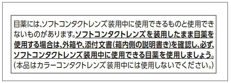 | 目の疲れ、ソフトコンタクトレンズまたはハードコンタクトレンズを装着している時の不快感、目のかすみ(目やにの多いときなど)、目のかゆみ、紫外線その他の光線による眼炎(雪目など)、眼病予防(水泳のあと、ほこりや汗が目に入ったときなど) |