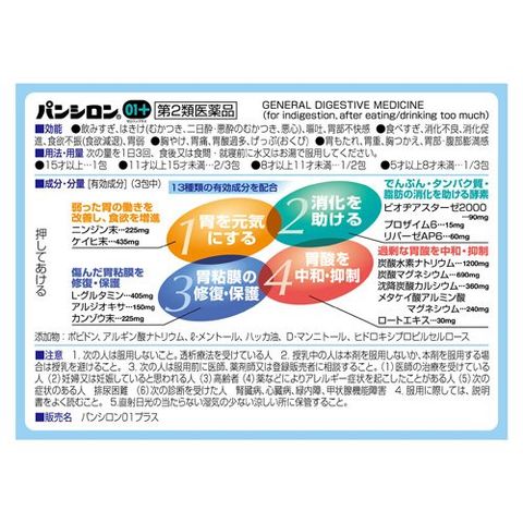 ●胃をスーッとさせる速効性制酸剤と持続性制酸剤、荒れた胃粘膜を整える粘膜修復剤と健胃剤、さらに消化を促進する消化酵素など、胃腸薬の基本機能に必要な有効成分をバランスよく配合しました。