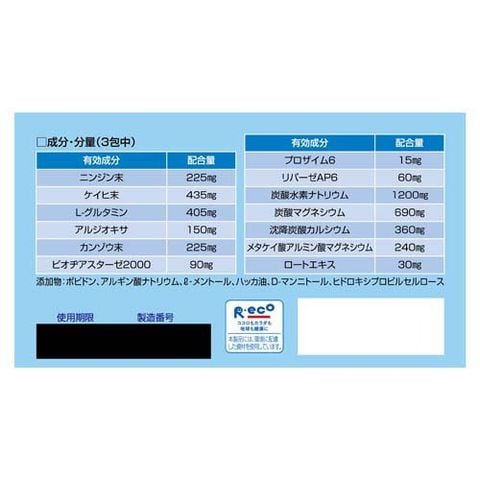 | ★有効成分(3包中) [有効成分と配合量] L-グルタミン(粘膜修復剤):405mg アルジオキサ(粘膜修復剤):150mg カンゾウ末(粘膜修復剤):225mg ケイヒ末(健胃剤):435mg ニンジン末(健胃剤):225mg 炭酸水素ナトリウム(制酸剤):1200mg 炭酸マグネシウム(制酸剤):690mg 沈降炭酸カルシウム(制酸剤):360mg メタケイ酸アルミン酸マグネシウム(制酸剤):240mg ロートエキス(制酸剤):30mg ビオヂアスターゼ2000(消化剤):90mg プロザイム6(消化剤):15mg リパーゼAP6(消化剤):60mg 添加物:ポビドン、アルギン酸ナトリウム、l-メントール、ハッカ油、D-マンニトール、ヒドロキシプロピルセルロース |