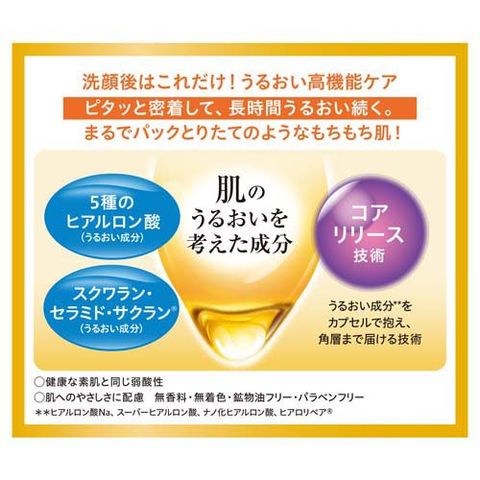 ※1ヒアルロン酸Na、アセチルヒアルロン酸Na(スーパーヒアルロン酸)、加水分解ヒアルロン酸(ナノ化ヒアルロン酸)、ヒアルロン酸ヒドロキシプロピルトリモニウム(肌吸着型ヒアルロン酸)、加水分解ヒアルロン酸アルキル(C12-13)グリセリル(ヒアロリペア(R))
