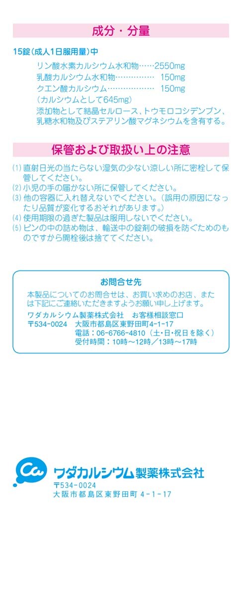 | (15錠(成人1日服用量)中) リン酸水素カルシウム水和物:2550mg 乳酸カルシウム水和物:150mg クエン酸カルシウム:150mg (カルシウムとして645mg) 添加物として結晶セルロース、トウモロコシデンプン、乳糖水和物及びステアリン酸マグネシウムを含有する。 |