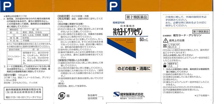 | 100mL中 ヨウ素:1.2g 液状フェノール:0.5mL グリセリン:90mL含有 添加物:ヨウ化カリウム、ハッカ水 |
