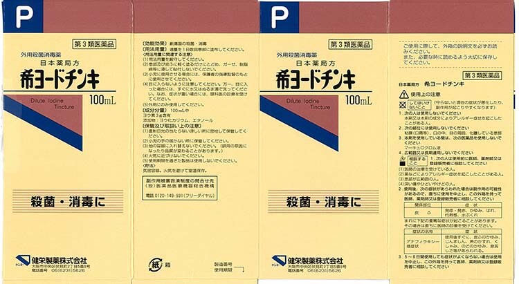 | 100mL中 ヨウ素:3g含有 添加物:ヨウ化カリウム、エタノール |