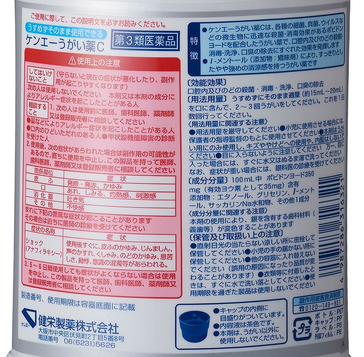 ●ケンエーうがい薬Cは、各種の細菌、真菌、ウイルスなどの微生物に迅速な殺菌・消毒効果があるポビドンヨードを配合したうがい薬で、口腔内及びのどの殺菌・消毒・洗浄、口臭の除去にすぐれた効果を発揮します。