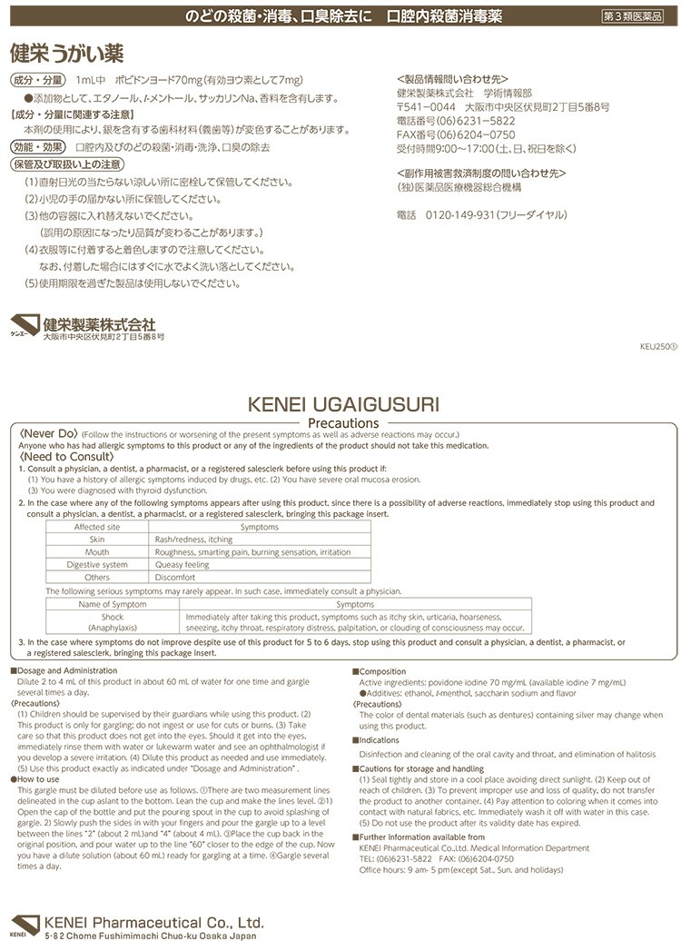●健栄うがい薬は、有効成分ポビドンヨードの殺菌・消毒効果と、うがいによる洗浄効果により、口腔内及びのどの殺菌・消毒、口臭の除去にすぐれた効果を示します。