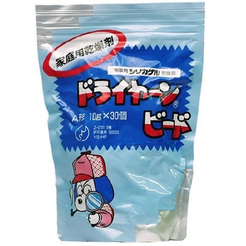 ●ドライヤーンはJISに合格したシリカゲルを使用しており、水溶性・腐蝕性・潮解性がまったくなく、無色・無味・無臭のガラス状で美しい光沢をもった乾燥剤で人体には無害です。