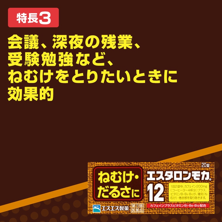 ●仕事中や勉強中、「ねむけ」「だるさ」で能率が上がらない。でも、もうひとがんばり。エスタロンモカ12はこんなときに役立つ、ねむけ除去剤です。