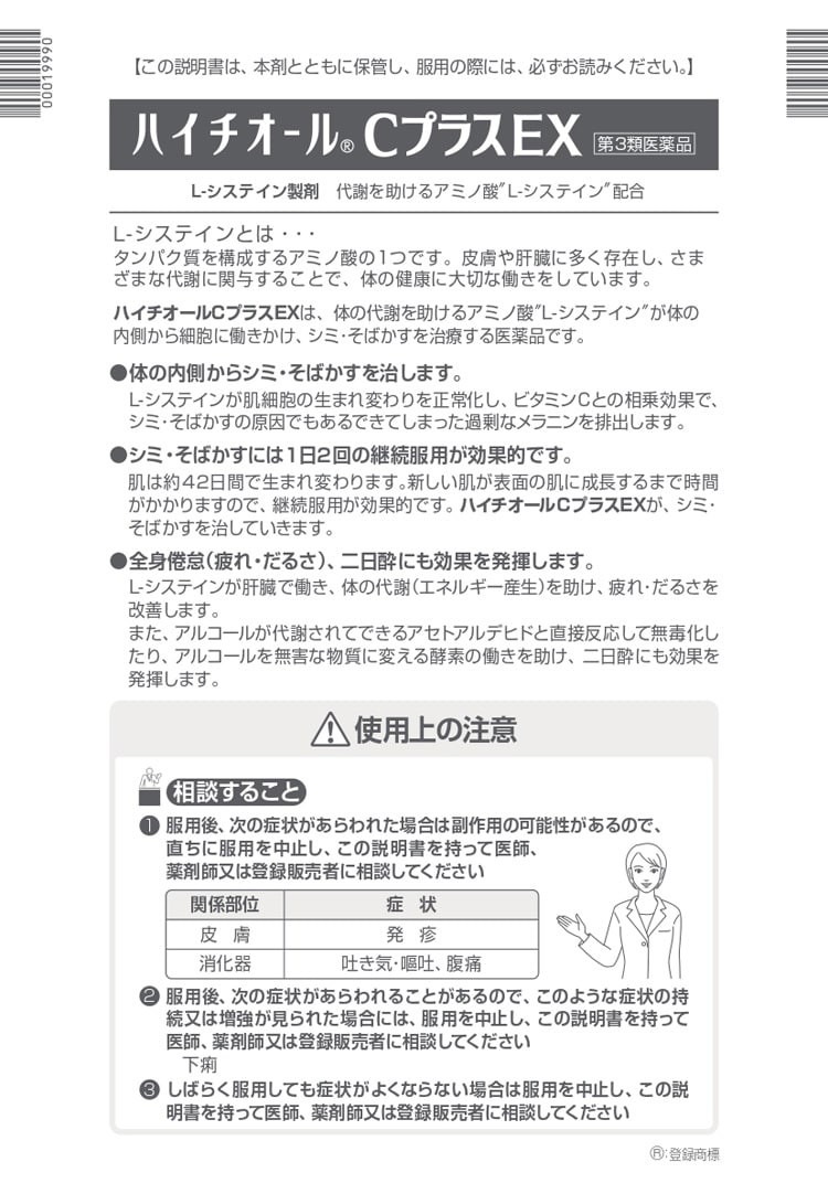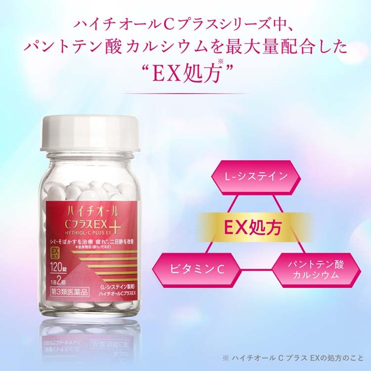 ●ハイチオールCプラスEXは、体の代謝を助けるアミノ酸「L-システイン」が体の内側から細胞に働きかけ、シミ・そばかすを治療する医薬品です。