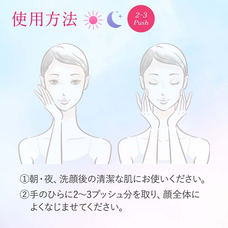 (2)手のひらに2~3プッシュ分を取り、顔全体によくなじませてください。