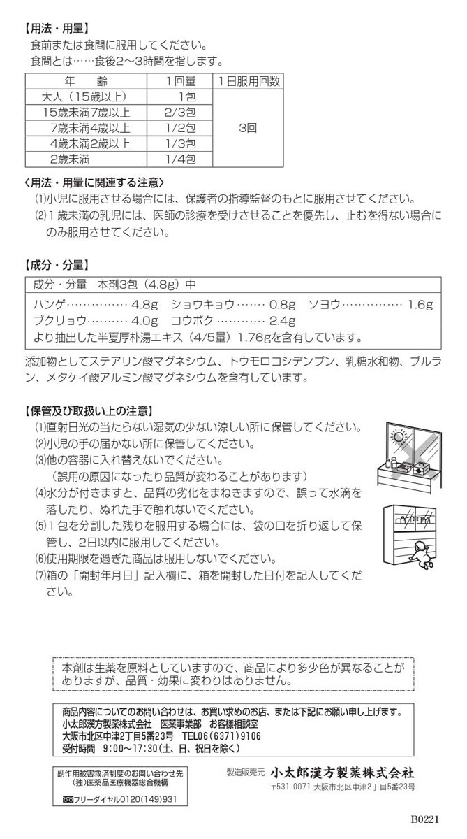 商品内容についてのお問い合わせは、お買い求めのお店、または下記にお願い申し上げます。 小太郎漢方製薬株式会社 医薬事業部 お客様相談室 大阪市北区中津2丁目5番23号 TEL06(6371)9106 受付時間9:00-17:30(土、日、祝日を除く) 製造販売元 小太郎漢方製薬株式会社 〒531-0071 大阪市北区中津2丁目5番23号
