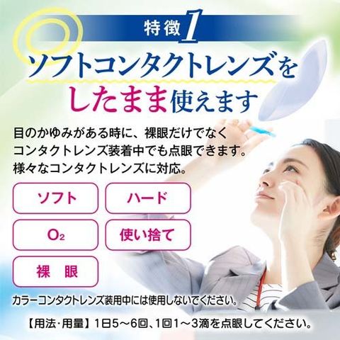 ●裸眼にもコンタクトレンズ装着時(使い捨て、ソフト、O2、ハード)にも点眼できます