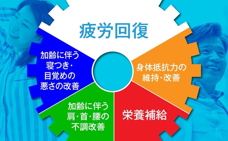 疲れやすい・疲れが残る・体力がない・身体が重い・身体がだるい、肩・首・腰又は膝の不調、寝付きが悪い・眠りが浅い・目覚めが悪い、肌の不調(肌荒れ、肌の乾燥)