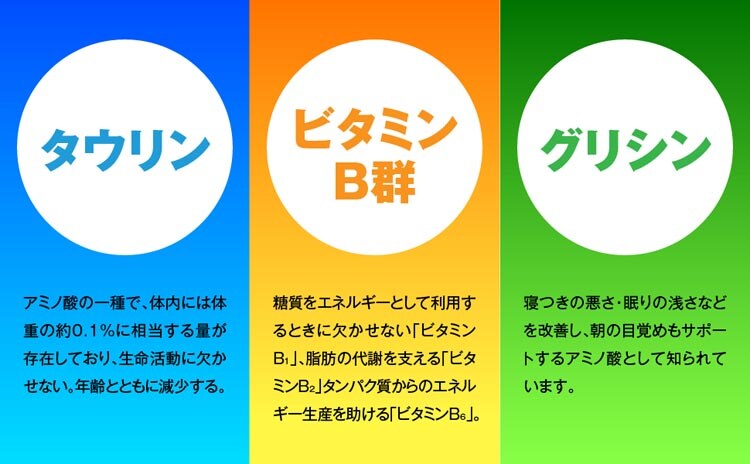 ●エナジーサイクルに働きかけるタウリンやビタミンB1・B2・B6をはじめ合計9種類の有効成分が、からだ全体の疲れを回復に導きます。