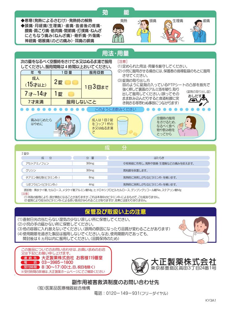 | 2錠中 成分:分量 アセトアミノフェン:300mg グリシン:300mg チアミン硝化物(ビタミンB1):8mg リボフラビン(ビタミンB2):4mg 添加物:無水ケイ酸、セルロース、メタケイ酸アルミン酸Mg、ヒドロキシプロピルセルロース、デンプングリコール酸Na、ステアリン酸Mg ★注意 (1)本剤の服用により、尿が黄色になることがありますが、これは本剤中のビタミンB2によるもので、ご心配ありません。 (2)錠剤により成分のビタミンB2による赤い斑点がみられることがありますが、効果には変わりありません。 |