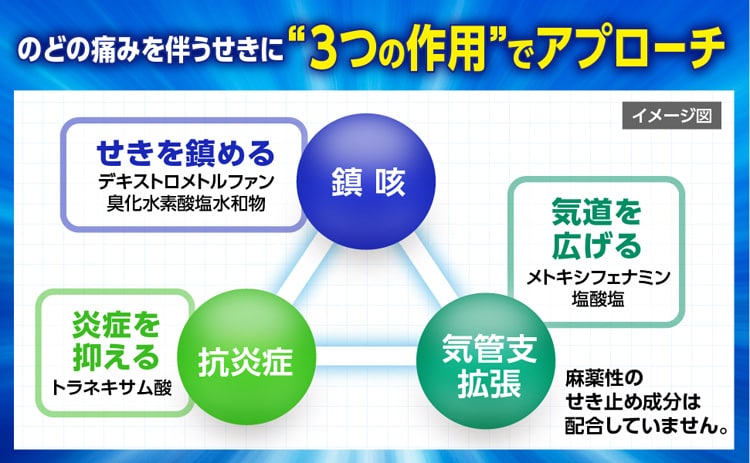 | 1錠中 [成分:分量:はたらき] デキストロメトルファン臭化水素酸塩水和物:15mg:せき中枢にはたらき、せきをしずめます。 クロルフェニラミンマレイン酸塩:3mg:抗ヒスタミン作用により、せきをしずめます。 メトキシフェナミン塩酸塩:37.5mg:気道を広げ、呼吸を楽にして、せきの発生をおさえます。 トラネキサム酸:70mg:せきやのどの痛みの原因となる炎症をしずめます。 添加物:セルロース、リン酸水素Ca、メタケイ酸アルミン酸Mg、デンプングリコール酸Na、ヒドロキシプロピルセルロース、ステアリン酸Mg、タルク、マクロゴール、酸化チタン、ヒプロメロース |