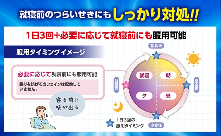 ●1日3回食後及び必要に応じてせきが気になる就寝前にも服用可能です。