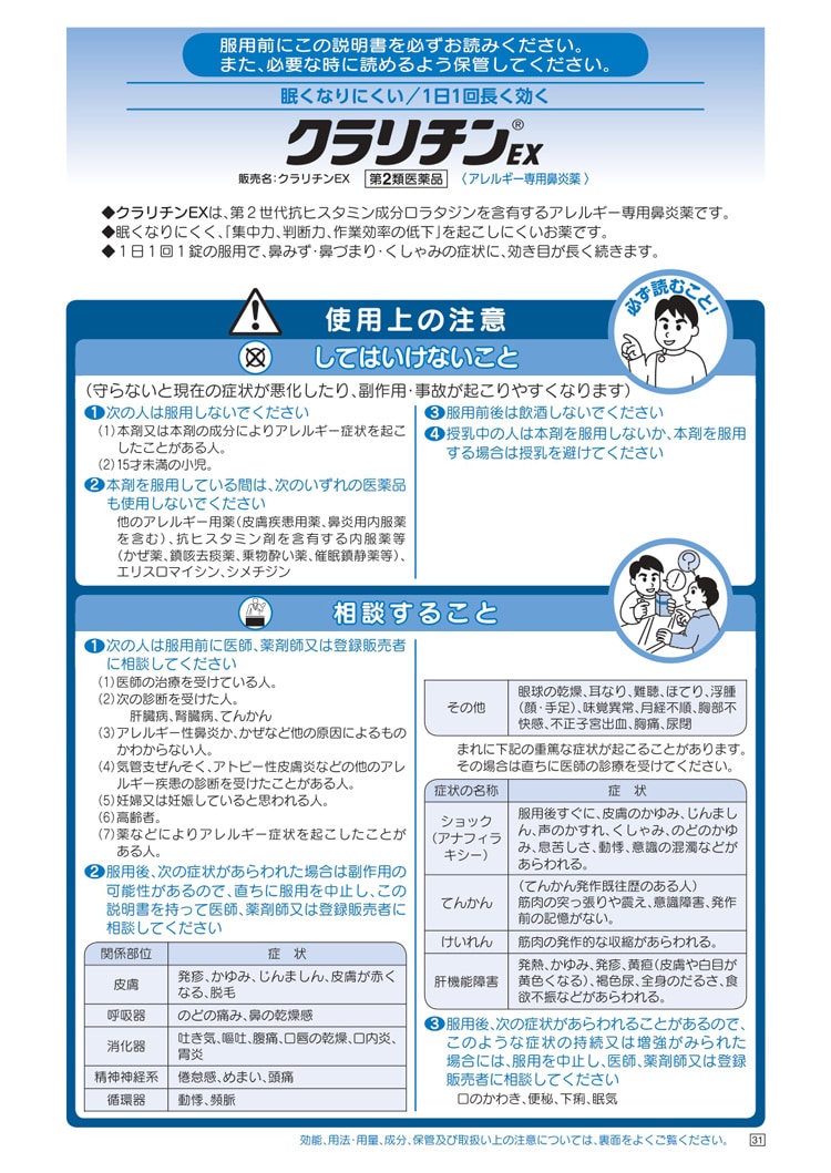 ●クラリチンEXは、第2世代抗ヒスタミン成分ロラタジンを含有するアレルギー専用鼻炎薬です。