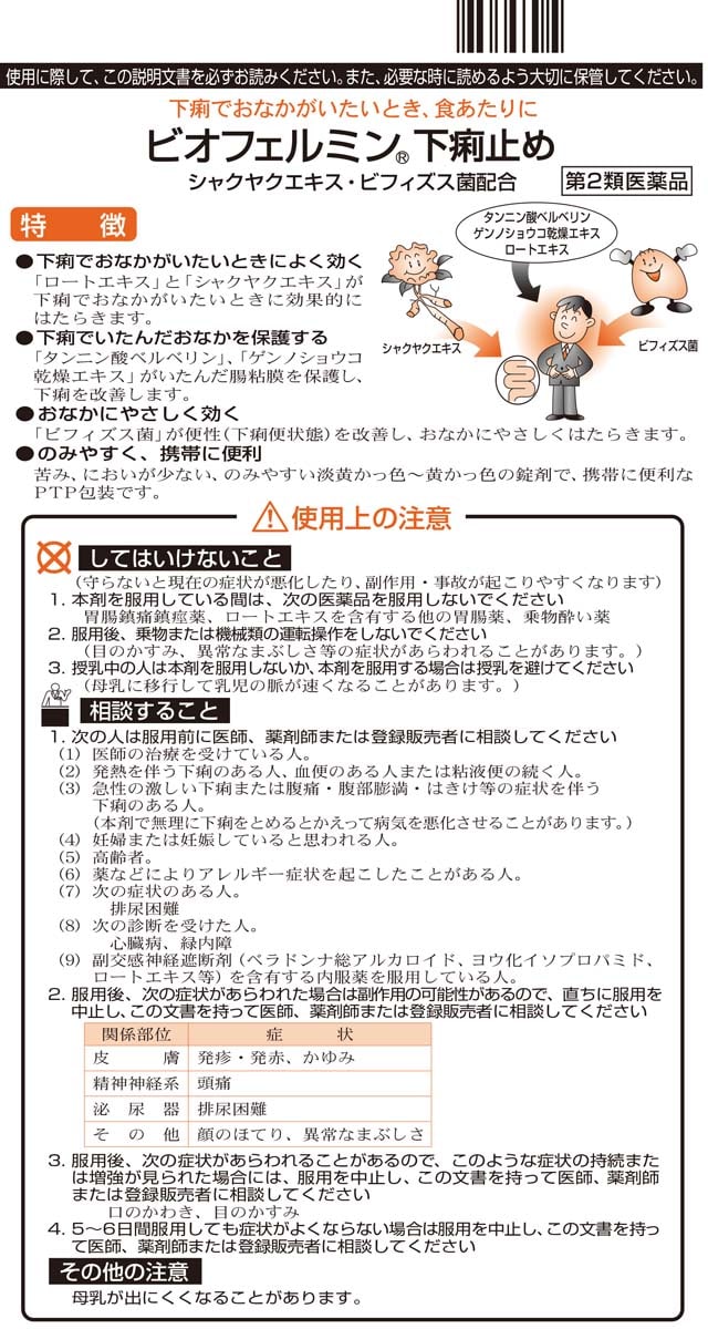 | (9錠中) タンニン酸ベルベリン:300mg ゲンノショウコ乾燥エキス:420mg(ゲンノショウコ約4200mgより抽出) ロートエキス:33mg シャクヤクエキス:125mg(シャクヤク約500mgより抽出) ビフィズス菌:30mg 添加物:トウモロコシデンプン、アメ粉、カルメロースカルシウム、タルク、ステアリン酸マグネシウム ★成分に関連する注意 生薬(薬用の草根木皮など)を用いた製品ですから、製品により錠剤の色調や味が多少異なることがありますが、効果には変わりありません。 |