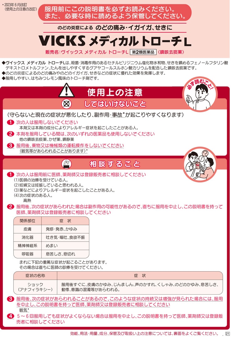 ●ヴイックス メディカル トローチLは、殺菌・消毒作用のあるセチルピリジニウム塩化物水和物、せきを鎮めるフェノールフタリン酸デキストロメトルファン、たんを出しやすくするグアヤコールスルホン酸カリウムを配合した鎮咳去痰薬です。
