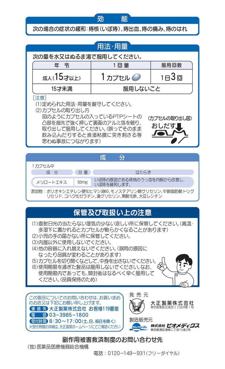 | 1カプセル中 成分:分量:はたらき メリロートエキス:50mg:いぼ痔の原因である痔核のうっ血を内側から改善し、いぼ痔を緩和します。 添加物:ポリオキシエチレン硬化ヒマシ油60、モノステアリン酸グリセリン、中鎖脂肪酸トリグリセリド、コハク化ゼラチン、濃グリセリン、黒酸化鉄、大豆レシチン |