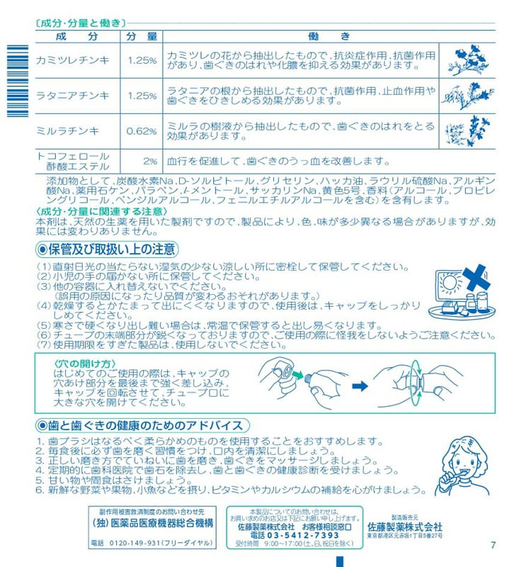 | カミツレチンキ:1.25% ラタニアチンキ:1.25% ミルラチンキ:0.62% トコフェロール酢酸エステル:2% 添加物として、炭酸水素Na、D-ソルビトール、グリセリン、ハッカ油、ラウリル硫酸Na、アルギン酸Na、薬用石ケン、パラベン、l-メントール、サッカリンNa、黄色5号、香料(アルコール、プロピレングリコール、べンジルアルコール、フェニルエチルアルコールを含む)を含有します。 ★成分・分量に関連する注意 本剤は、天然の生薬を用いた製剤ですので、製品により、色、味が多少異なる場合がありますが、効果には変わりありません。 |