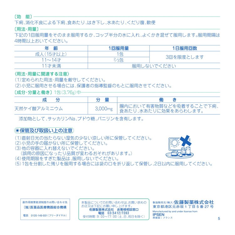 | 1包(3.76g)中 天然ケイ酸アルミニウム・3000mg 添加物として、サッカリンNa、ブドウ糖、バニリンを含有します。 |