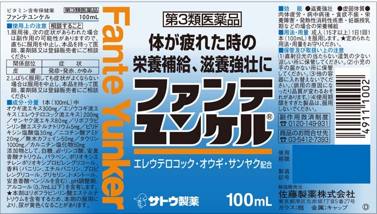 | 1本(100ml)中 オウギ流エキス:300mg エゾウコギ流エキス(エレウテロコック流エキス):200mg サンヤク流エキス:80mg リボフラビンリン酸エステルナトリウム:5mg ピリドキシン塩酸塩:30mg ニコチン酸アミド:20mg 無水カフェイン:50mg タウリン:1000mg カルニチン塩化物:50mg 添加物として、白糖、dL-リンゴ酸、安息香酸ナトリウム、パラベン、ポリオキシエチレンポリオキシプロピレングリコール、香料(バニリン、エチルバニリン、プロピレングリコール、グリセリン、L-メントール、安息香酸ベンジルを含む)、pH調整剤、アルコール(0.7ml以下)を含有します。 |