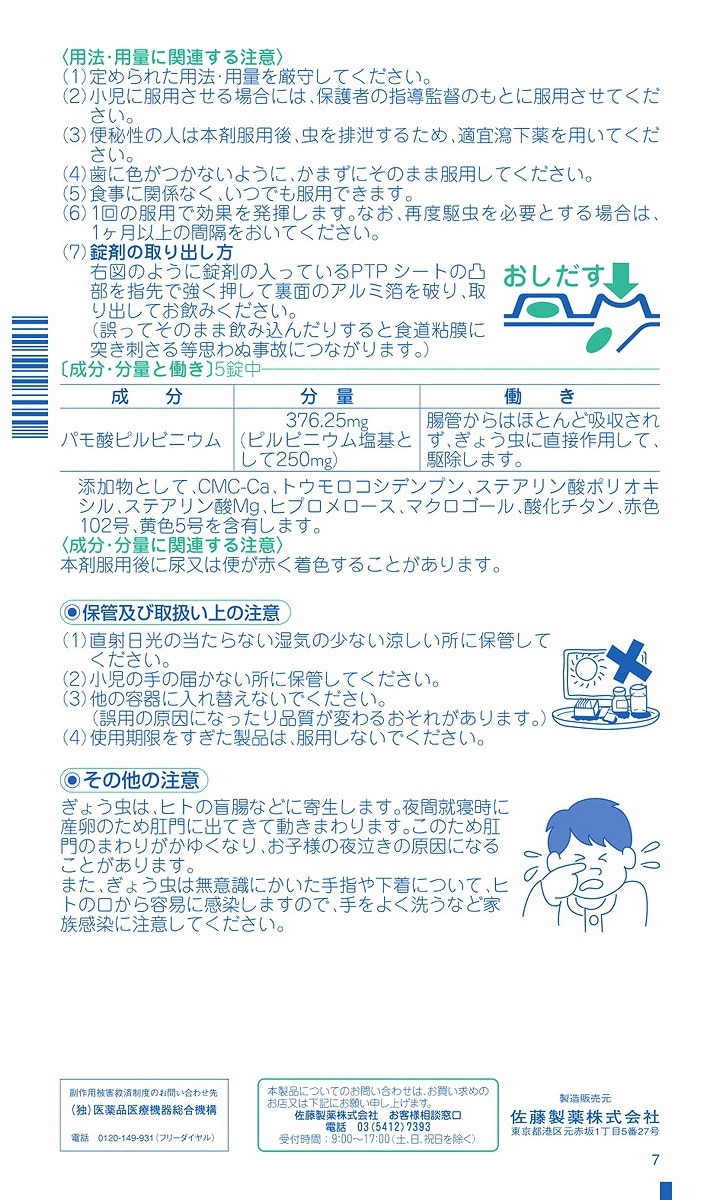 | (5錠中) パモ酸ピルビニウム:376.25mg(ピルビニウム塩基として250mg) 添加物としてCMC-Ca、トウモロコシデンプン、ステアリン酸ポリオキシル、ステアリン酸Mg、ヒプロメロース、マクロゴール、酸化チタン、赤色102号、黄色5号 ★成分・分量に関連する注意 ・本剤服用後に尿又は便が赤く着色することがあります。 |