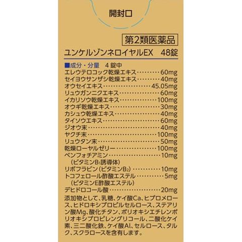 | 4錠中 エレウテロコック乾燥エキス:60mg セイヨウサンザシ乾燥エキス:40mg オウセイエキス:45.05mg リュウガンニクエキス:60mg イカリソウ乾燥エキス:100mg オウギ乾燥エキス:30mg カシュウ乾燥エキス:40mg タイソウエキス:60mg ジオウ末:40mg ヤクチ末:100mg リュウタン末:50mg 乾燥ローヤルゼリー:100mg ベンフォチアミン(ビタミンB1誘導体):10mg リボフラビン(ビタミンB2):10mg トコフェロール酢酸エステル(ビタミンE酢酸エステル):5mg デヒドロコール酸:20mg 添加物として、乳糖、ケイ酸Ca、ヒプロメロース、ヒドロキシプロピルセルロース、ステアリン酸Mg、酸化チタン、ポリオキシエチレンポリオキシプロピレングリコール、二酸化ケイ素、三二酸化鉄、ケイ酸Al、セルロース、タルク、スクラロースを含有します。 ★成分・分量に関連する注意 本剤はビタミンB2を含有するため、本剤の服用により、尿が黄色くなることがあります。 |