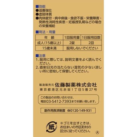 | ・滋養強壮 ・虚弱体質 ・肉体疲労・病中病後・食欲不振・栄養障害・発熱性消耗性疾患・妊娠授乳期などの場合の栄養補給 |