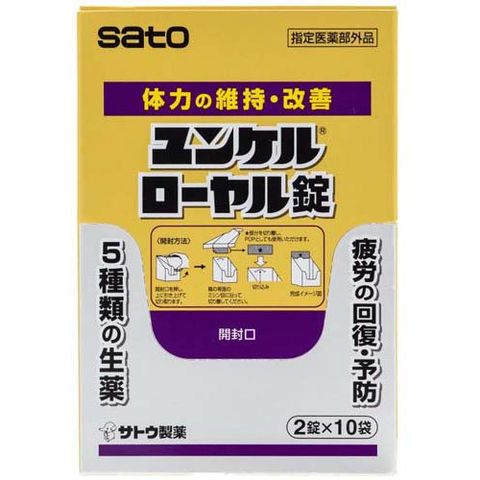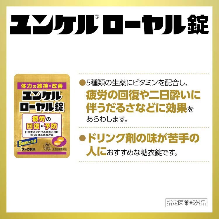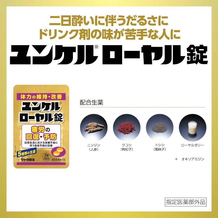 ●ローヤルゼリー、ニンジン、オキソアミヂン末などの5種類の生薬に各種ビタミンを配合し、疲労の回復や二日酔いに伴うだるさなどに効果をあらわします。