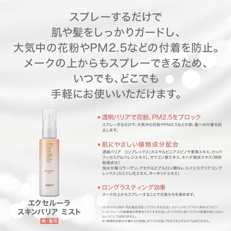 ●透明バリアで花粉、PM2 .5 をブロックスプレーで、大気中の花粉やPM2 .5 などの肌髪への付着を防止します。