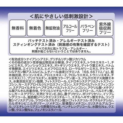 | 有効成分:ナイアシンアミド、グリチルリチン酸ジカリウム その他の成分:党参抽出物加水分解液、タイソウエキス、トウキエキス-1、チンピエキス、ゲンノショウコエキス、オトギリソウエキス、ゲットウ葉エキス、ハトムギ発酵液、エイジツエキス、ヒメフウロエキス、ローヤルゼリーエキス、テトラヘキシルデカン酸アスコルビル、レチノール油液(ビタミンA 166、667ΙU/g)、藍水抽出液、カッコンエキス、アロエエキス-2、クロレラエキス、トウニンエキス、チャエキス(1)、ブリエラスチン、水溶性コラーゲン液-3、アルテロモナス発酵エキス、水素添加大豆リン脂質、フィトステロール、ヒドロキシステアリルフィトスフィンゴシン、N-ステアロイルジヒドロスフィンゴシン、ステアロイルフィトスフィンゴシン、ステアロイルオキシへプタコサノイルフィトスフィンゴシン、アクリル酸・メタクリル酸アルキル共重合体、ラウリルジメチルベタイン、コレステロール、パルミチン酸、シュガースクワラン、天然ビタミンE、BG、濃グリセリン、ポリグリセリン、イソプレングリコール、脂肪酸ジペンタエリスリチル-1、エチルヘキサン酸セチル、リンゴ酸ジイソステアリル、ラウロイルグルタミン酸ジ(フィトステリル・オクチルドデシル)、カルボキシビニルポリマー、ジメチコン、架橋型ジメチコン、ミリスチルアルコール、ジエチレントリアミン5酢酸5N a液、ペンチレングリコール、水酸化N a、クエン酸、クエン酸Na、フェノキシエタノール |