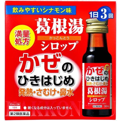 | 3本(90mL)(大人の1日服用量)中、次の成分を含有します。 [成分:3本中] 葛根湯エキス(カッコン8g、マオウ4g、タイソウ4g、ケイヒ3g、シャクヤク3g、カンゾウ2g、ショウヨウ1gより得た軟エキス):8.3g 添加物として、白糖、D-ソルビトール、ポリオキシエチレン硬化ヒマシ油、安息香酸Na、パラベン、香料(L-メントール)を含有します。 |